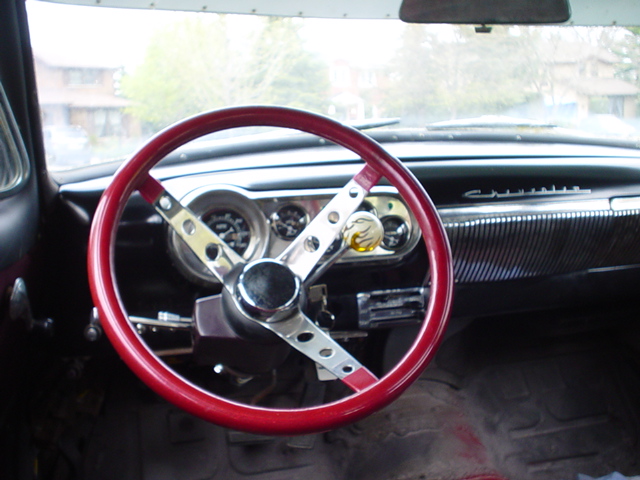 Dolphin gauges, late-model GM steering column, vintage WWII US training grenade (shift knob), hurst slap shifter, Smiths vintage air gauges in glove box.