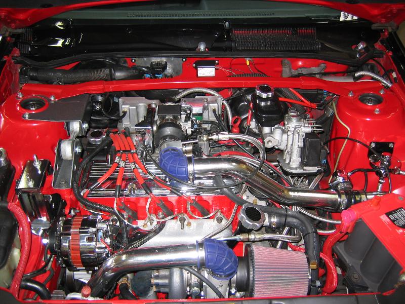 2.2L, Garret t28 turbo, turbo specialties fuel & intercooler kit, eagle rods & pistion, rebuilt head, mantapart cam, aluminum radiator, unichip standalone computer, Noligy spark plug wires, RSM racing cold air intake, dual electric fans, chrome altinator, cutom 2.5" cat and pipe, Magnoflow muffler and tip, Mrz performace billit Accesores