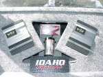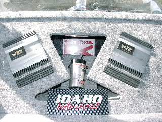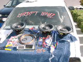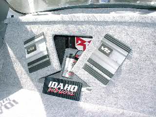 2 12" Rockford Power DVC subs, 2 600 watt Alpine V12 amps, 1 farad red rockford Cap, and .5 farad rockford silver cap. 2 guage wire. Infinity Kappa mids/highs. Kenwood Headunit, Pioneer Eq