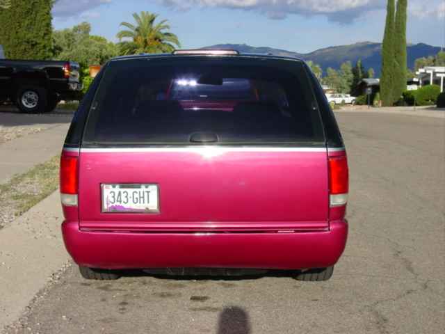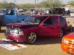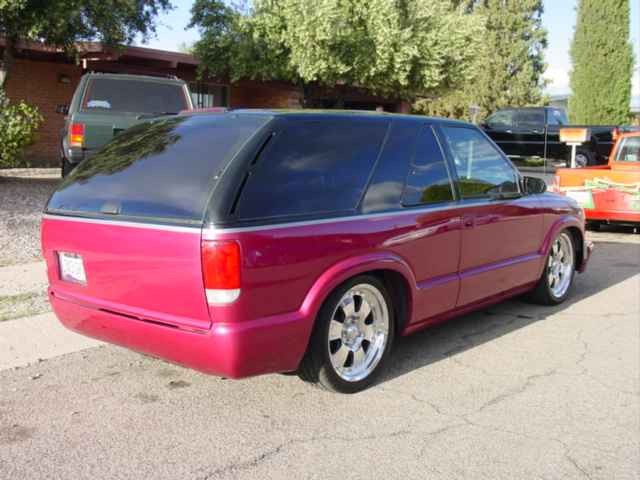98 Chrome blazer LS bumper,Billet Specalties wipers,Trenz billet antenna, Trenz billet Lic. plate cover,Street Scene Mirrors, Custom roll pan, shaved roof rack,Trendz Billet Inserts and Bowtie,clear corners,All emblems Shaved,Street Scene smooth cowl,H-4 diamond crystal headlight conversion,old school clear tails(instead of damn altezzas), 2 tone paint job black and rasberry metallic, done by Fat Paul at Murals'N'More.