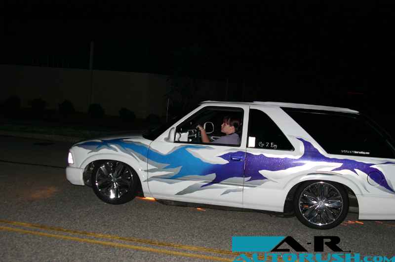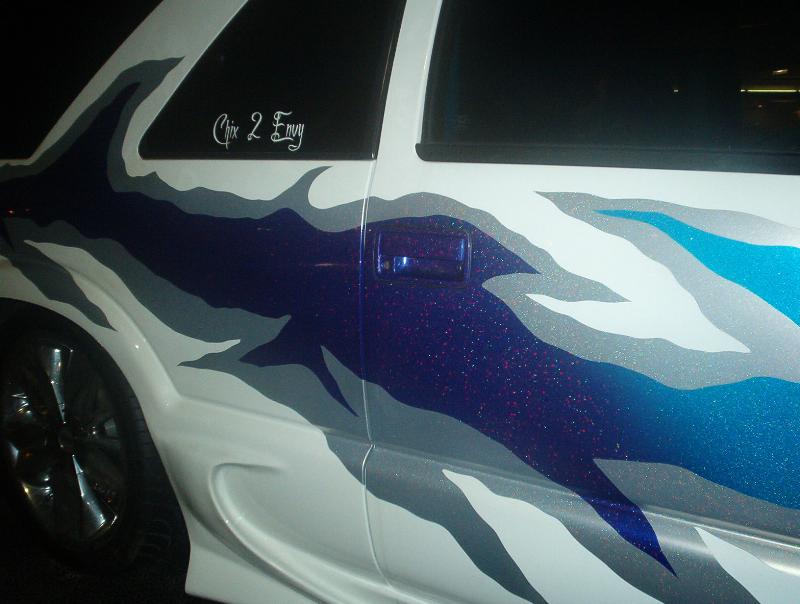 White with Silver, Blue & Purple Graphics (Paint), Clearcoated with prizmitic on graphics,Clear Altezza''''s all around, Flowmaster Exhaust,Fullsize Chevy Bumper....