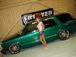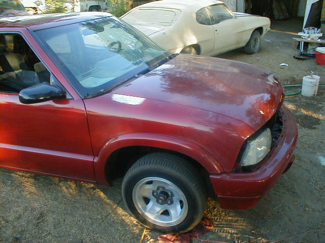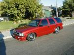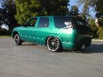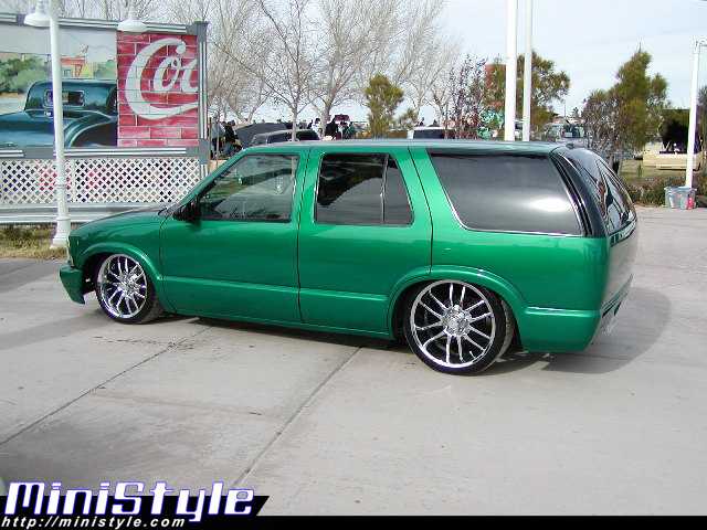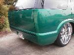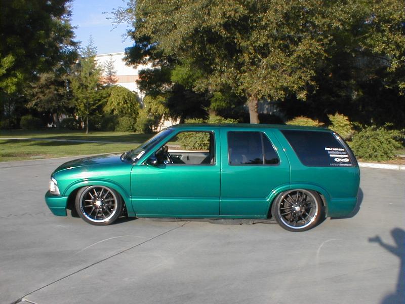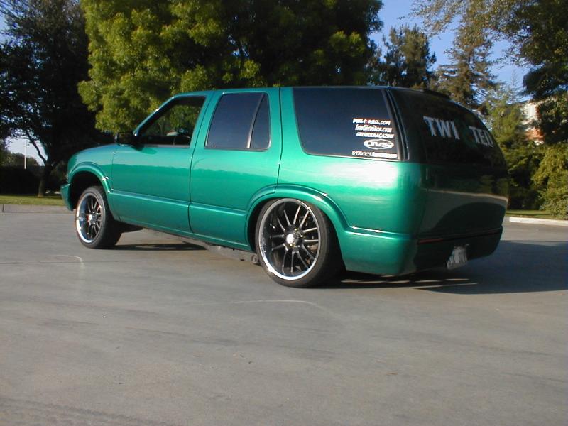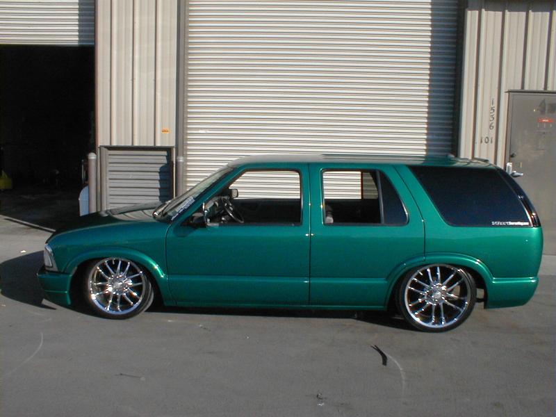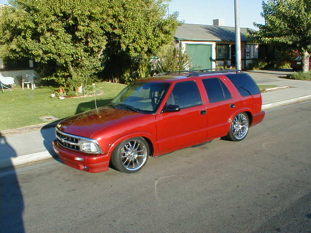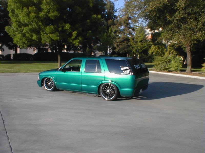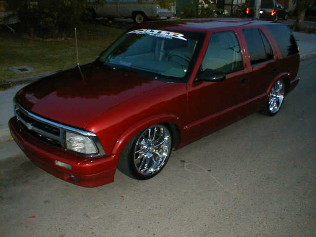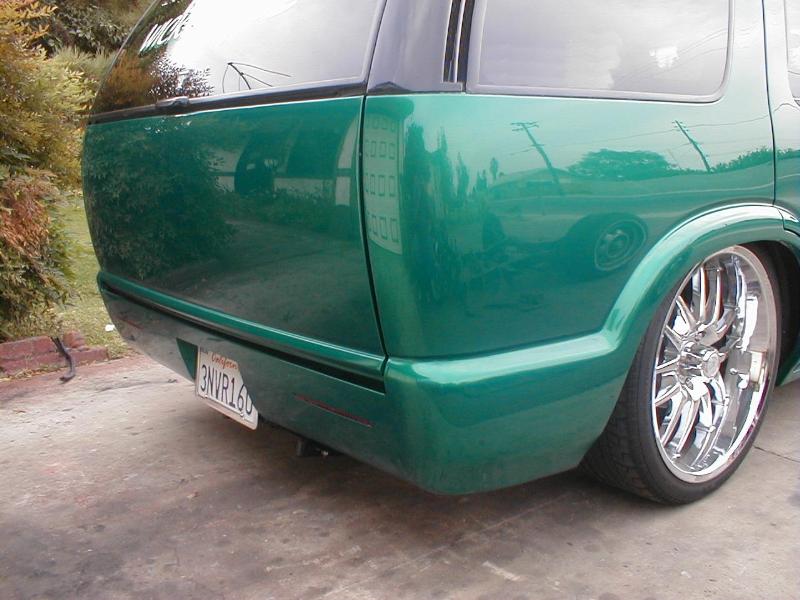 shaved door handles,antenna,hood squirters,gas door,tailights,rear wiper,rear lock,roof rack,(basically everything that wasn't needed)removed rear bumper and added an F.B.I. S-10 rollpan with LED tailights. Thanks to Central Valley Customs(559)287-6380 for the paint and bodywork.98 s-10 front bumper, billet grille,door poppers installed by Autotronix(now AVS), just installed 12 channel remote box to open doors and can control airbags with remote, and airhorn.