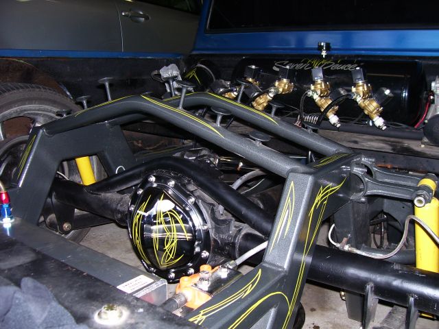 early classic drop spindles,2600lb bags with a kit from suicide doors and an abortion of a bag set up in the back with an early classic pan hard bar"First time around" Second round is to cut the retarded notch I welded in and finish the back half with 2X4 and a suicidedoors 4 link.