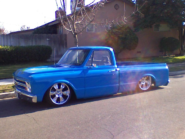 The suspension was done by several buddies of mine. They fabbed up a cantilever setup in the rear with the kp monster notches. i have two Vair comps, 1 6-gallon airtank, 8- 1/2" SMC valves, with a ten switch box. I also have 2 1/2 drop spindles. I have 2600 lbs bags all round.