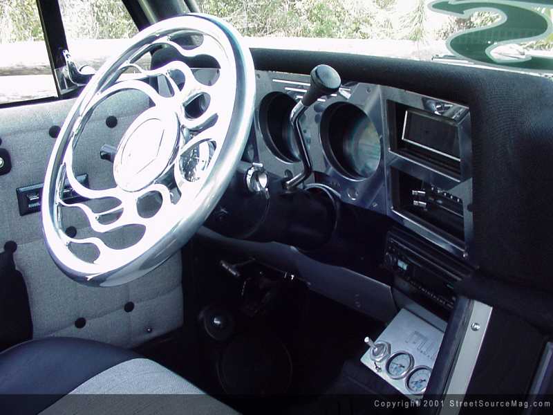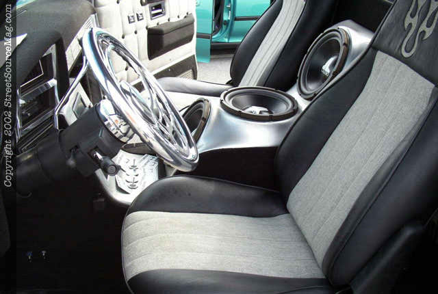 BLACK AND GREY TWEED INTERIOR. CAMARO BUCKET SEATS IN BLACK VINYL AND GREY TWEED W/FLAMES. ALL POLISHED ACCESSORIES. FULLY POLISHED COLORADO CUSTOMS FLAMED STEERING WHEEL. CUSTOM PAINT MATCHED FIBERGLASS CENTER CONSOLE HOUSING 3 JL 10'S.