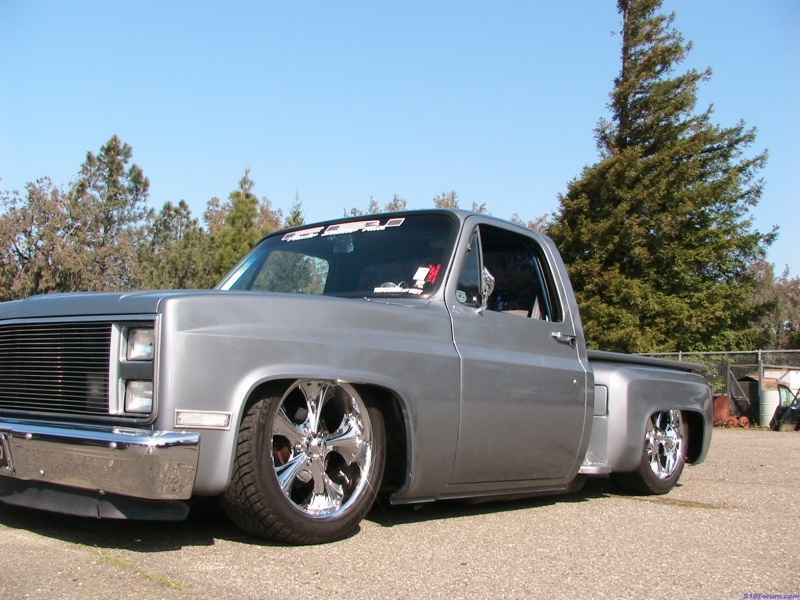 Fresh DuPont Silver Metallic paintjob done by myself. Shaved emblems, mirrors, drip rails, cab molding, bed stake pockets. Corvette tailights, flamed motorcycle style mirrors, billet grille, and clear corners