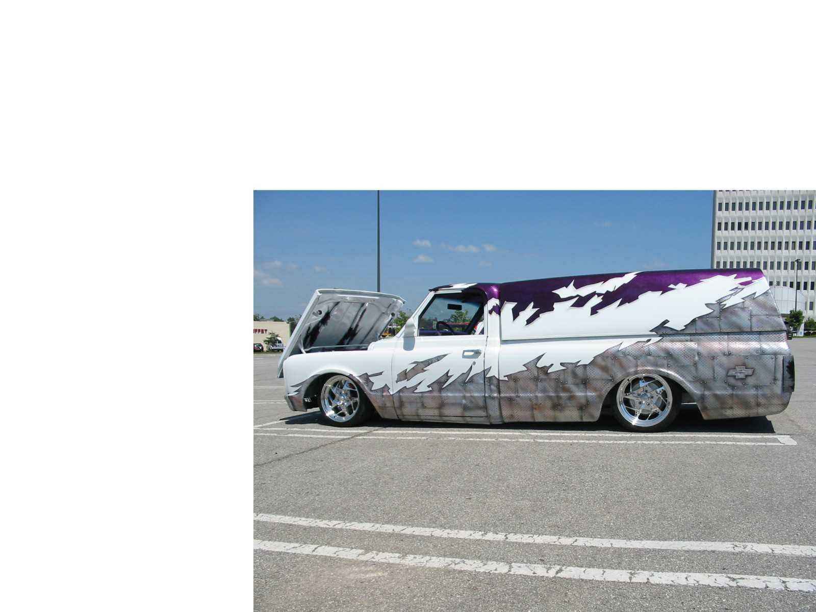 White with Silver pearl violt marbelizer and diamond tread air brush work.Also two Captian America murals.