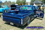 shaved molding, roof seam, door handles, gas filler, tailgate handle, marker lights painted chevy arrival metallic blue with candy green flames and skulls ghosted in in the green