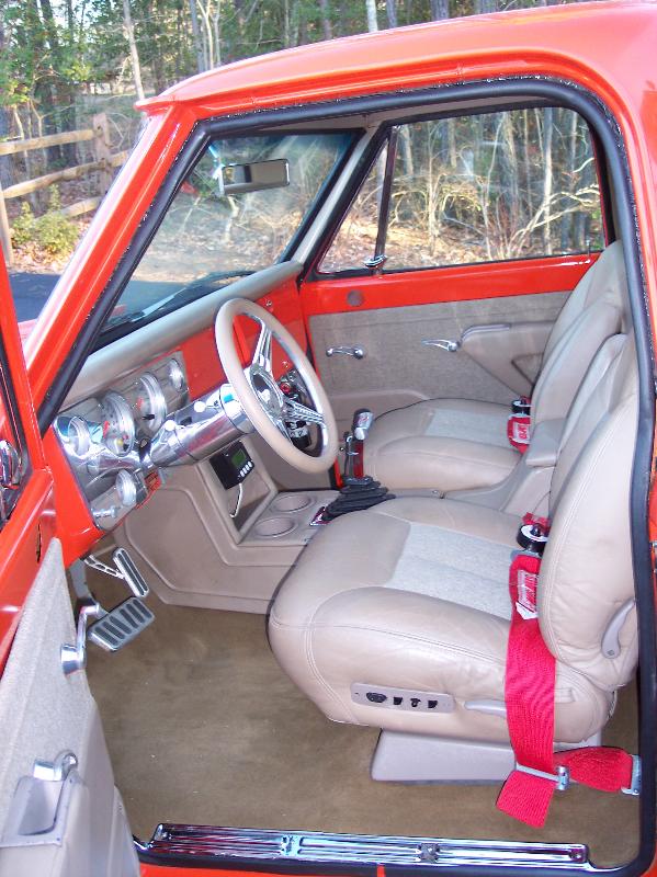 leather power seats, custom leather console,leather dash, headliner, tweed and leather door panels, Autometer gauges, B@M rachet shifter.