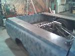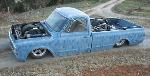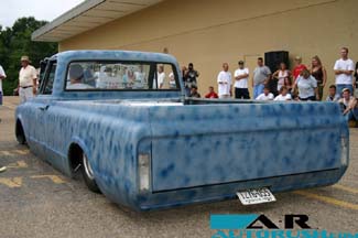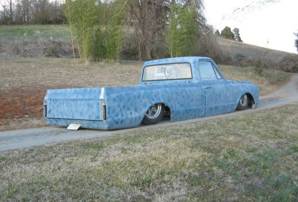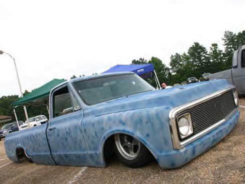 gray primer & blue guide coat w/ fenders molded to front roll pan and cowl vent. Shaved:tailgate, emblems, mirrors, cab seam, stake pockets, marker lights, moldings, antenna and drip rails. Billet grill,w/ turn signals behind grill, billet hood pins, clear tailights a chrome peep mirror at the top of the door.