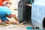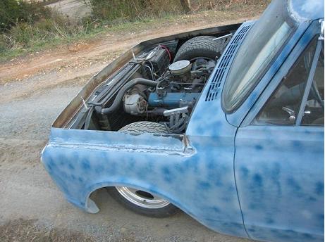 350 w/ four barrel Quadrajet carb., and electronic ignition. Fender wells hacked out. Turbo 350 tranny with torquemaster 2000 stall converter