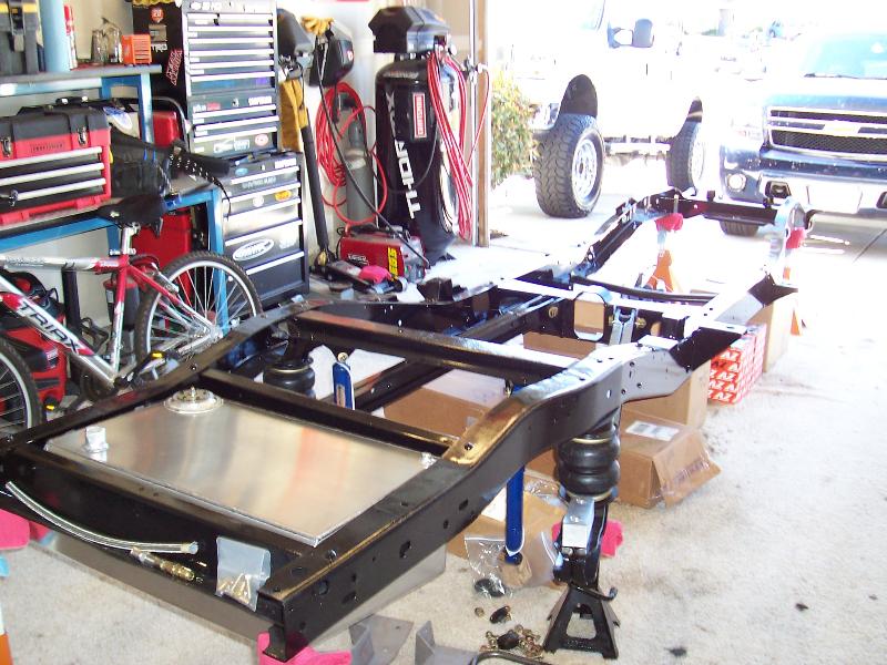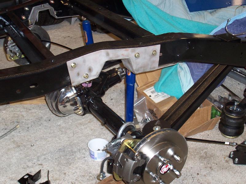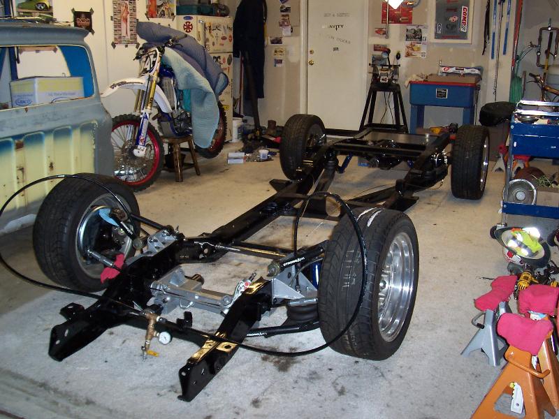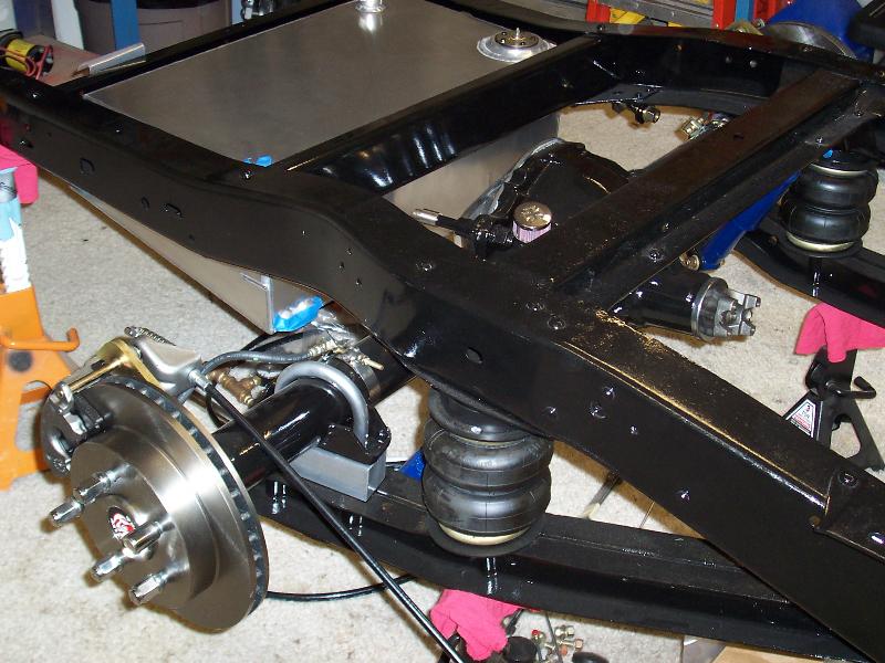 porterbuilt front xmember, mustang rack,ART upper and lower arms, bags, front disc kit, rear bagged with disc brakes,fully built rearend with a 3:73 posi with 5x5 axles, stainless panhard bar, everything stainless hardlines air,fuel,brakes, por-15 frame and xmembers, aluminum fuel cell in rails,1 1/8 front sway bar