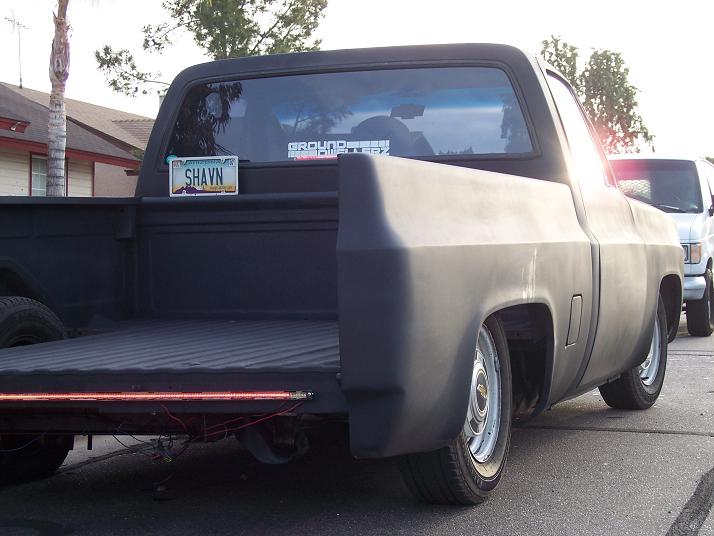 now: starting from the front, shaved turn signals, badges, molding, mirrors, drip rails, roof seam, handles, locks, stake pockets, and tail lights.