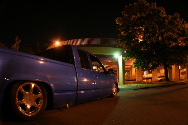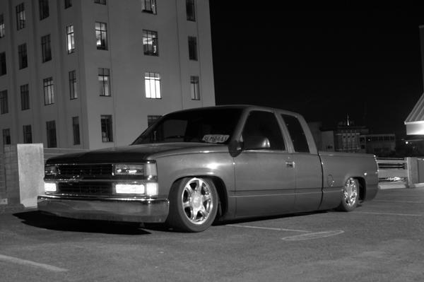 a 2-1/2" body drop, 22" black with a polished lip (brand unknown) shave the doors, custom cowl hood, custom front bumper and new roll pan, relocate tailgate handle