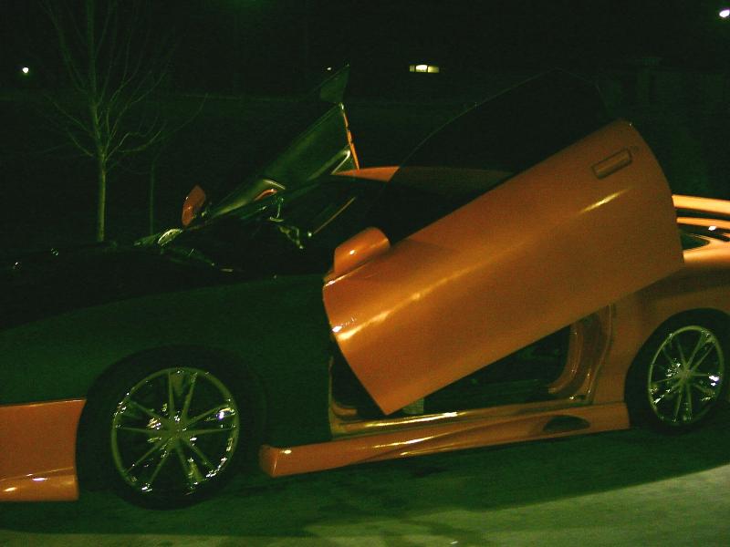 xennon front clip, vizage sides and rear shaved body line and antenna, carbonfiber ss hood , commando wing, black halo headlights, altessa tail lights, orange led light kit, custom diamond plate grille, custom billet blinker grilles, lambo doors