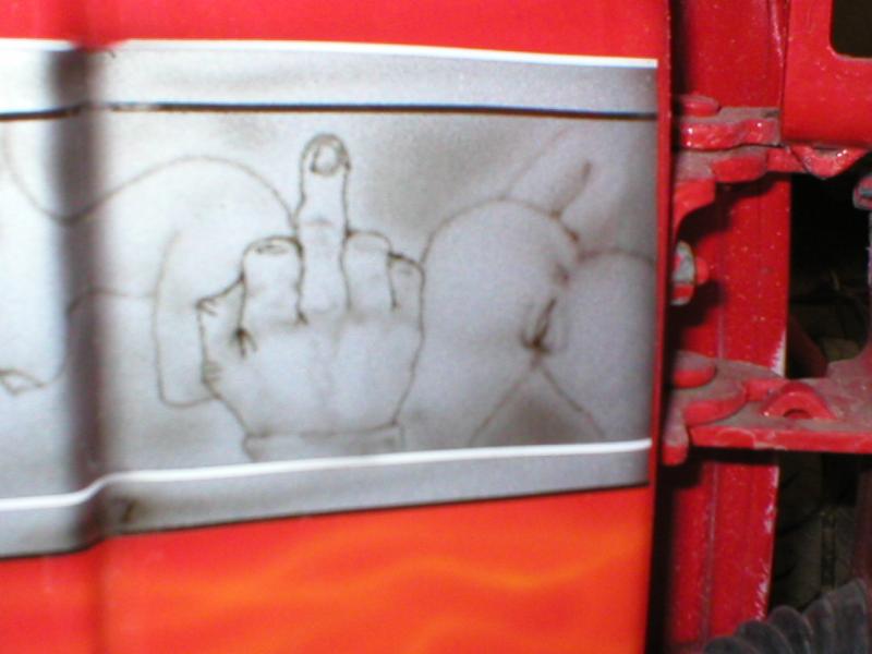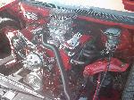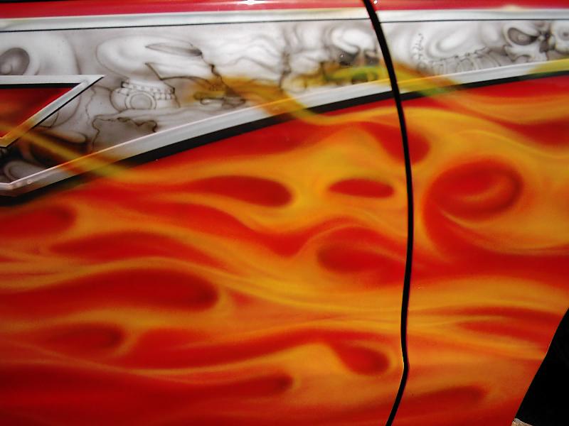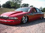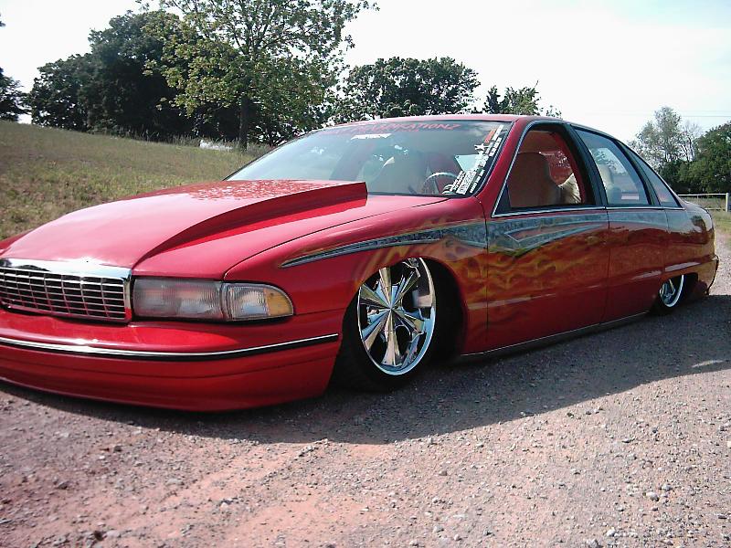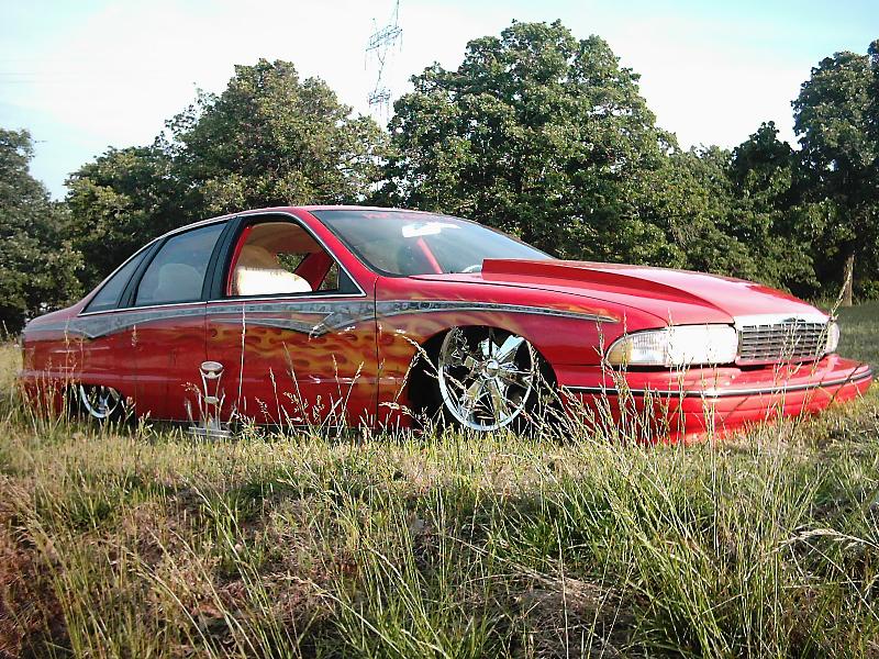 Now body dropped 3.25 inches. Lays all 4 doors. Shaved handles, mirrors, antannae, hood ornament, Torch red with airbrushed chrome molding and airbrushed graphics including skulls, titties, ass, and pussy done by Derek Holder at Creative Customs in OKC. Also custom made cowl hood.