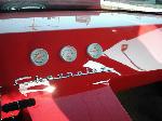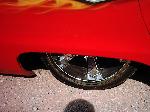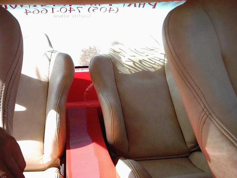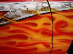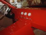 B.A.D. Hellfire wheel and flamed billet rear view mirror. Four 3-A racing bucket seats wrapped in "bone" vinyl. Sheet metal dash and rear section and console. Relocated window switches.
