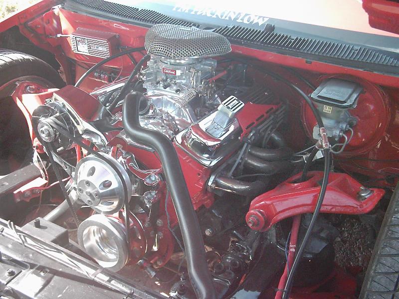 Crate 350, polished- alternator, intake, pulleys, valve covers, MSD crab distributor MSD box and external coil and MSD crank trigger stainless headers edelbrock 600 carb turbo 400 tranny