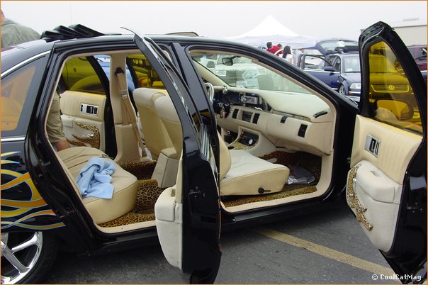 Completely custom tan tweed w/leopard flames and carpet/floormats. Orande tinted windows to match the flames.