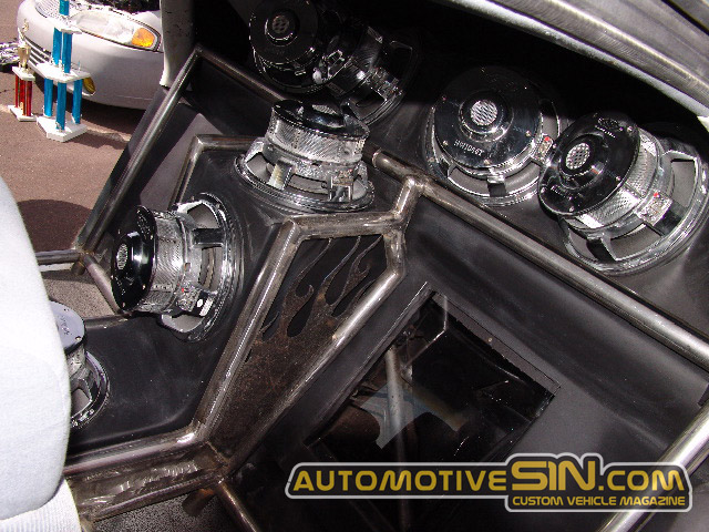 FIBERGLASS AND PAINTED DASH, FIBERGLASS CENTER CONSOLE EXTENDING FROM THE DASH ALL THE WAY BACK TO THE REAR DECK HOUSING THE RELOCATED WINDOW SWITCHES AND 4 NICHE AUDIO TENS, CUSTOM FIBERGLASS BOX THAT SITS IN THE REAR WINDOW HOUSING ANOTHER 4 NICHE AUDIO TENS (SO 8 TENS IN TOTAL), CUSTOM PLATED TUBULAR REAR SEAT BRACKETS, ALL PLASTICS SANDED FIBERGLASSED AND PAINTED.