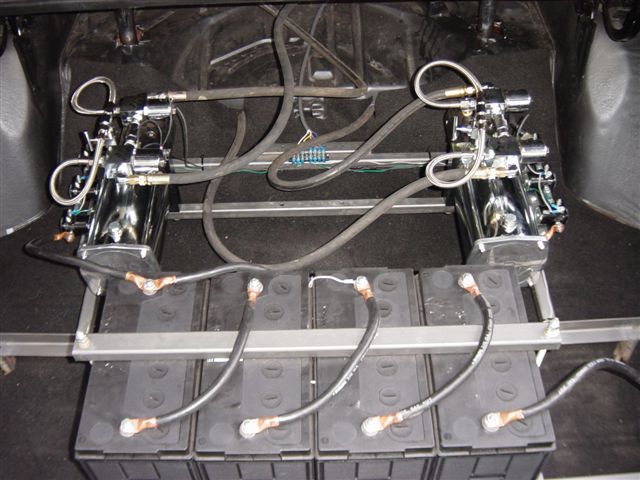 2 pump prohopper setup ,4 batteries,3 1/2 ton coils, 8 and 10 inch cylinders, power balls in the rear.battery rack welded to frame.rack is set up for 3 pumps and 6 batteries.