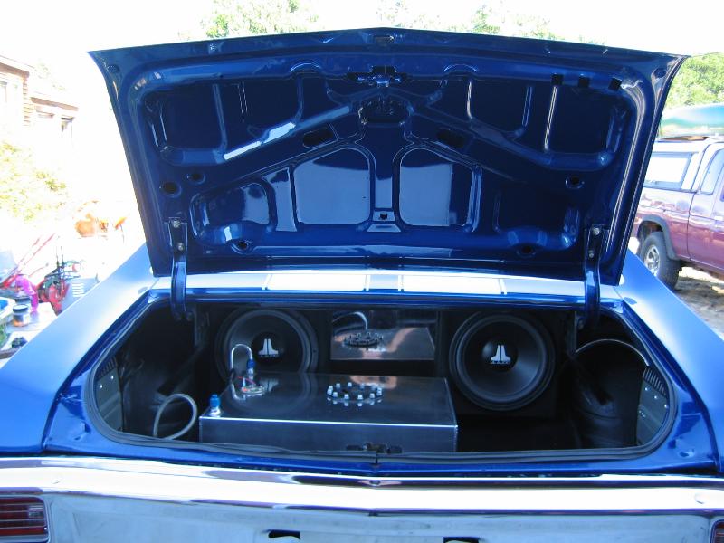 Alpine IVA-D300 flip out 7" touch screen cd\dvd player. Two JL Audio 12" subs custom built boxes. JL Audio 250watt one-channel amp for subs, and a JL Audio 300watt 4-channel amp for speakers. Infinity kappa perfect series 6x9s in the rear shelf, custom kickpanels with 140 watt kenwood speakers in them. One 140-watt center speaker in the center of the dash.