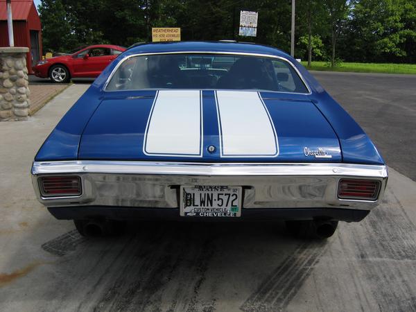 Painted electron blue, all new bumpers, chrome trim, stainless steel brakes lines, repainted frame, and underbody, 4" fibergalss cowl induction hood, custom emblems