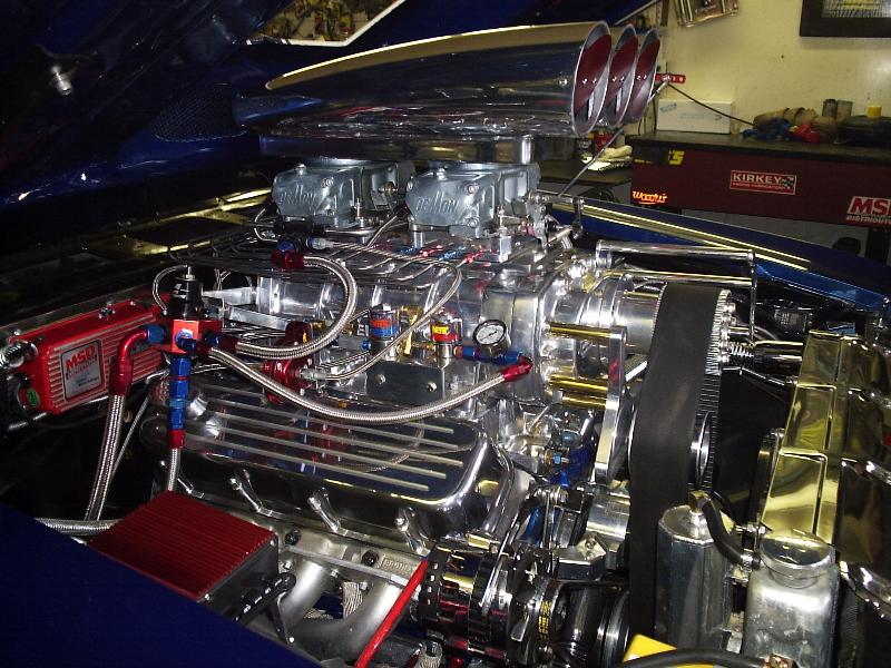 Merlin stage 1 572 Big Block with a Weiand 8-71 Blower, show quality polished nitrous system. Brodix BB2 Extra Aluminum firebreathing heads, JE 8.7:1 forced induction pistons, Eagle forged H-Beam connecting rods, Bullet custom blower camshaft, Comp Cams Pro Magnum roller rockers, comp cams pushrods, Jegs aluminum roller rocker stud girdel, dual Demon 850cfm 4-barrel blower carbs, pete jackson gear drive timing, CSI flexplate, CSI silver anodized electric water pump, custom headers, MSD 6BTM electronic ignition with MSD Blaster coil, MSD pro-billet distributor, aeromotive eliminator electric fuel pump, SSBC chrome brake booster with master cylinder, Strange solid spool 3.70 rear end