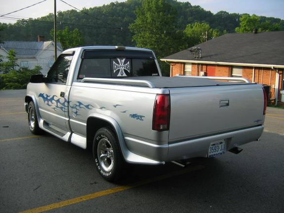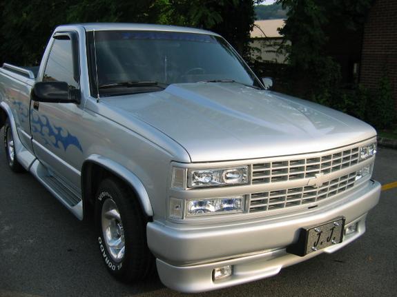 Galaxy Metallic Silver w/ Blue Vinyl Flames, Gen II Cowl Hood, custom headlights, markerlights, and turn sginals, custom front air dam, bed tarp, lund roll pan, and 15' pacer rims.