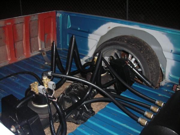 parallel 4ed w/ panhard bags overaxle, all 4 contis 4ply dual 3/4 port, 8 3/4 valves, 3/4 line, custom lower control arms by me up front, pie cut uppers for balljoint angle, tube work out back by me, pimpest switch box ever