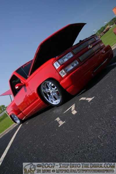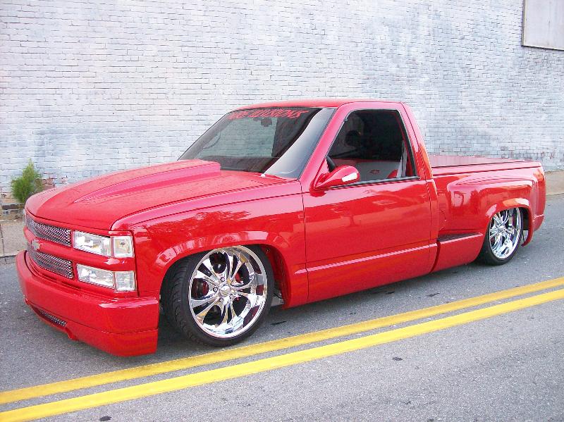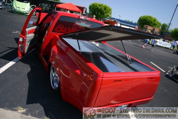 Stepside bed with Shaved rear steps and molded in rollpan from Superior Customs, Shaved door handles, Shaved taillights with LED lights in the tailgate, Shaved and relocated tailgate handle, smooth wipper cowl, custom tinted rear window with tinted flames and bowtie, tinted flames on driver and passenger windows, 30% tint on windshield, Street Scene grill inserts, SS valance w/insert and APC foglights, billet bowtie, billet antena, billet wiper covers, clear parking and corner lights, hyperwhite headlights, Goodmark cowl hood, M3 mirrors w/turn signals, Checkmate fiberglass bedcover w/carpet bedliner, billet bowtie third brake light cover, personal license plate, Street Glow neon lights underneath.