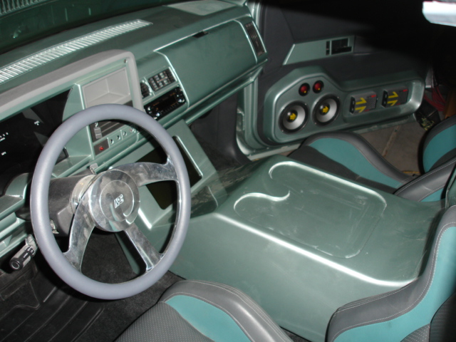 Paint matched everything, custom center console and door panels, gray and green upholstery.