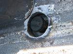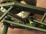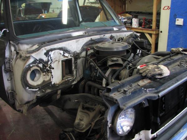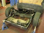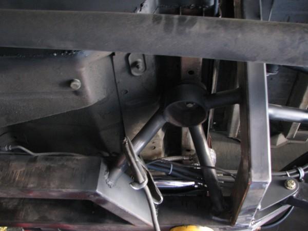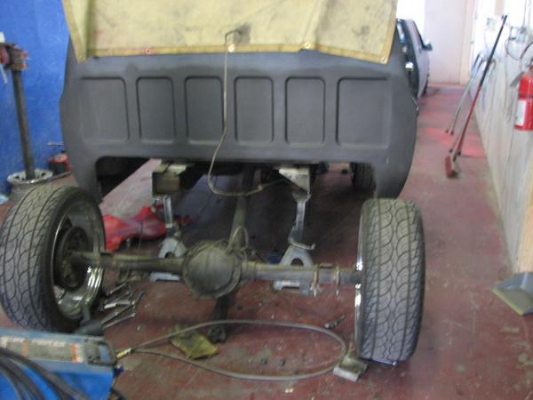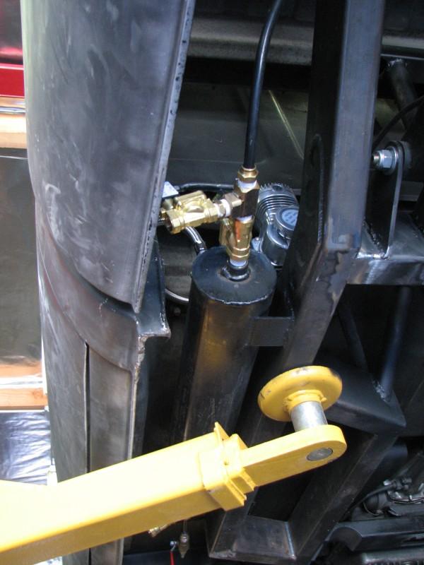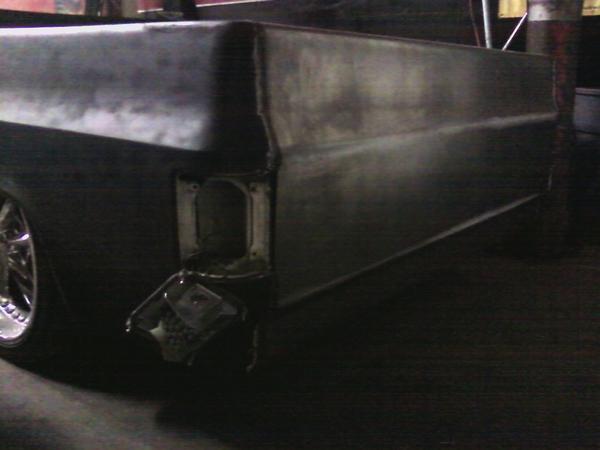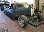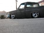 stock floored on 22s custom 3/4 frame, laying on stock control arms with drop spindles, contitech bags in front air lift dominators in the rear. custom tigged and built lower link bars. raised bed floor.