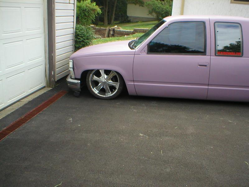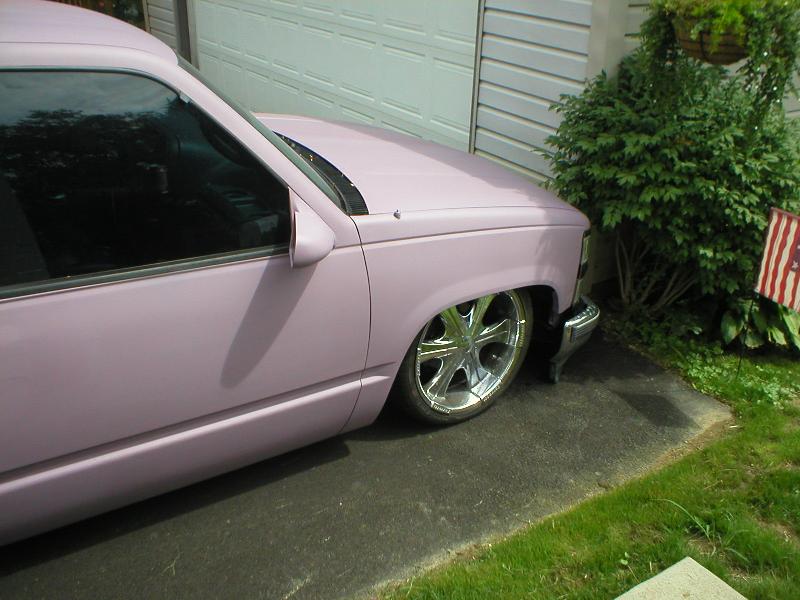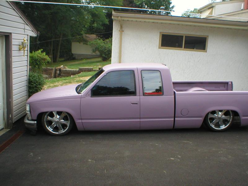 purple primer with shaved passengers side door handle.. no tailgate rollpan, dent in left front fender and rear quarter on passengers side