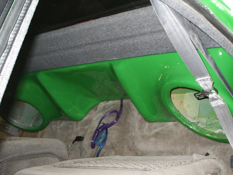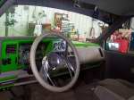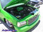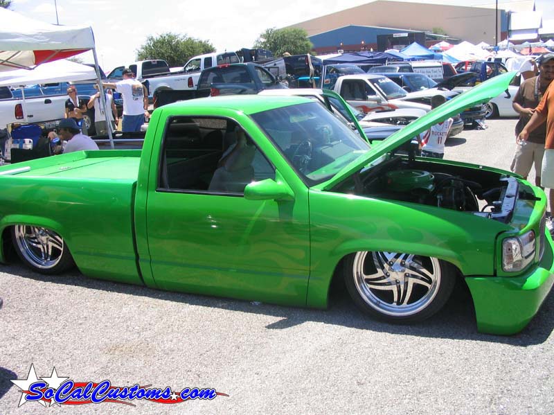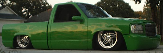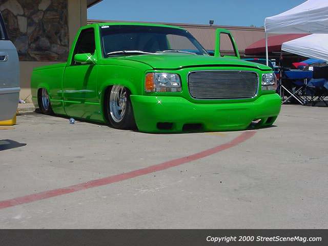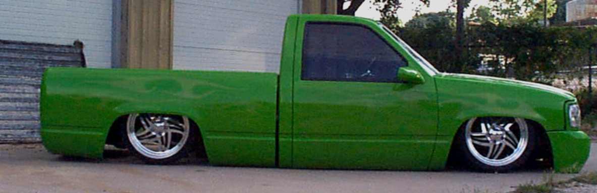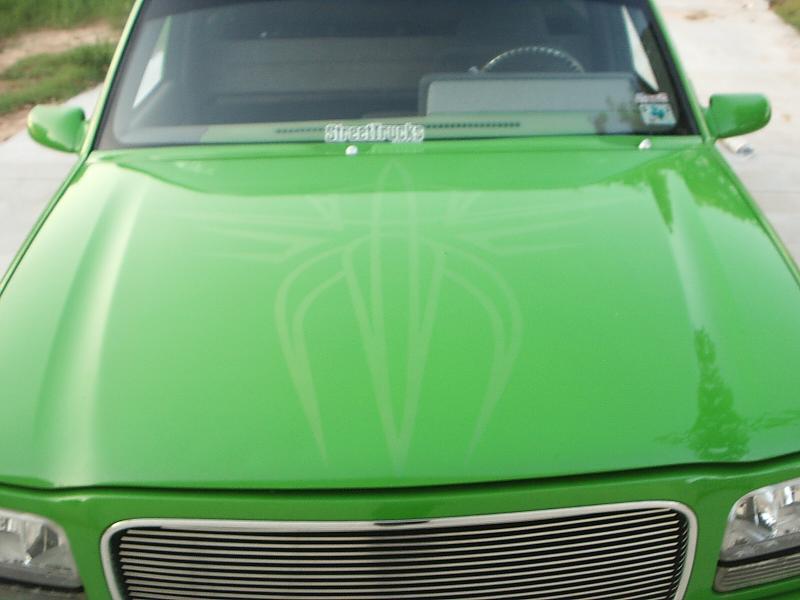 shaved handels, topbodyline, antenna, stakepost,tailgateskin, taillights, caddy taillight, bodydropped 3 1/2", bright fuckin green/ghost flames/ghosttribal on hood.