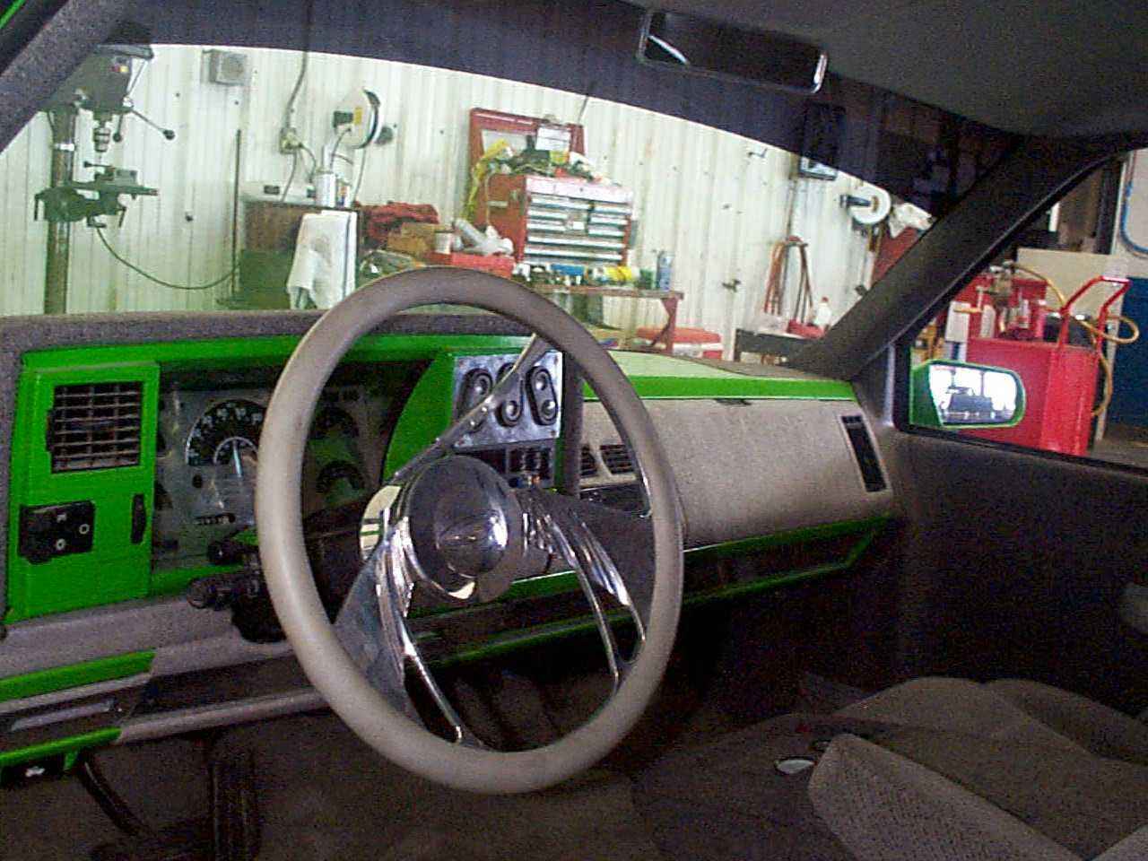 painted/tweed dash pieces, door panels, headliner, shaved interior handels,stock bucket seats for now billet budnik switchblade steering wheel. fiberglass console witha dakota digital guage and stock window switches for the bags. fiberglassed speaker box