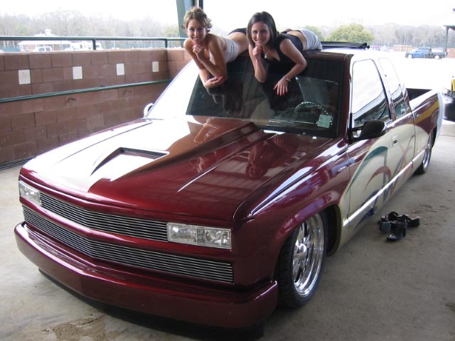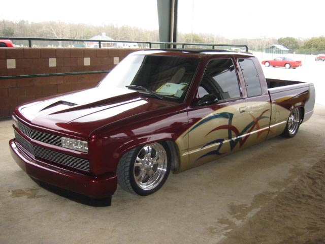custom paint,caddy lights,shaved cargo light,stake pockets,antenna,ram airstyle hood,shaved corner lights,1/2 phantom billet grills,2 frenched antennas,molded roll pan and shaved tailgate,a big ole' 40x40 ragtop