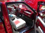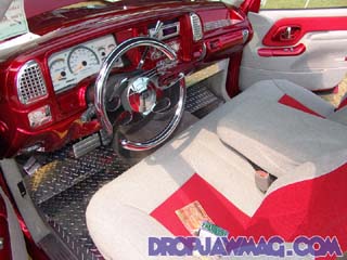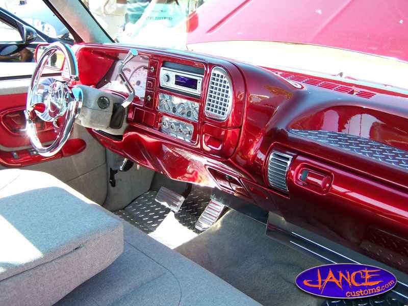 painted dash, billet a/c vents, diamond plated floormats, diamond plated cuphold cover, white face guages, light gray tweeded interior, brandywine leather also, billet steering wheel, shift handle, and grab handle