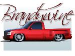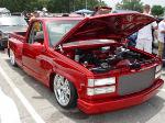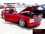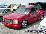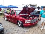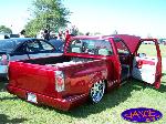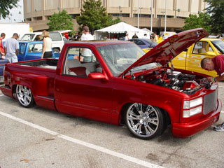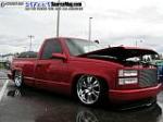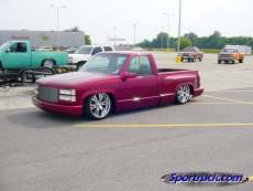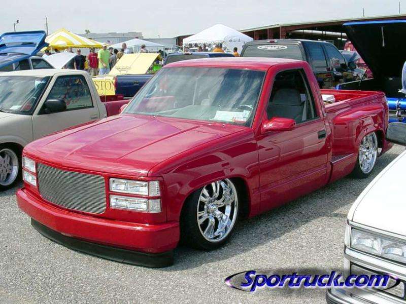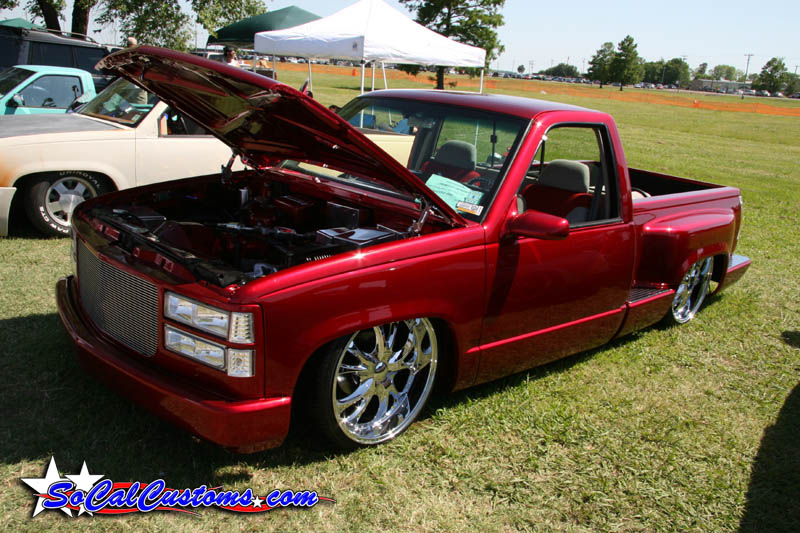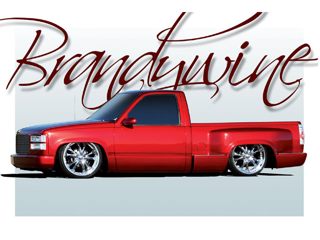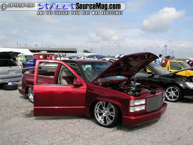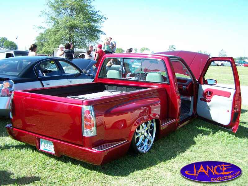 painted brandywine, shaved door handles,stack pockets, tailgate handle, third brake light, 30 bar billet gmc grille, billet step plates, billet antenna, euro taillights, corners, diamond back headlights, turn signals, and smooth bumper and rollpan
