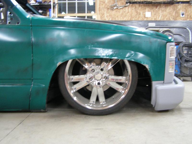 3"body drop,Shaved door handles,cab seams,third brake light,stake pockets,tailights,tailgate,Sheet metal bed,molded roll pan,reflection cowl hood, GMC grille,smooth front bumper, billet grille, euro corners and park light, projector beam head light,2001 chevrolet silverado mirrors, some round tailights and painted Planet Colors Mountain Magic Green