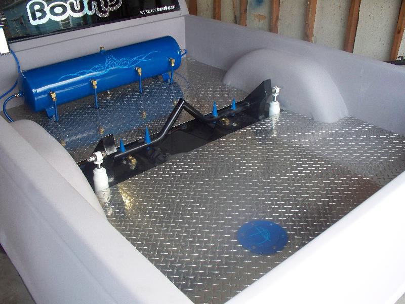 2004 front end swap shaved taligate handle,stake pockets thrid brake light,17 gal fuel cell put new cross member in powder coated drop spindles,brake drums,air cleaner battery holder,spikes,anything else thats blue on the truck.