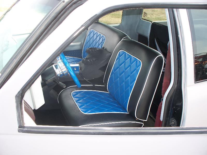 diamond tuck seats blue and black fiberglass console B.A.D steering wheeling skull stick shifter glass and sheet metal doors