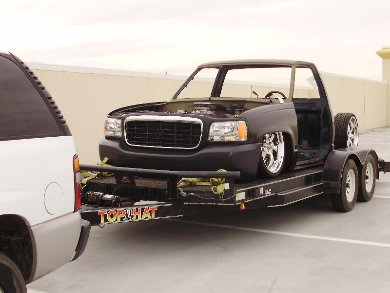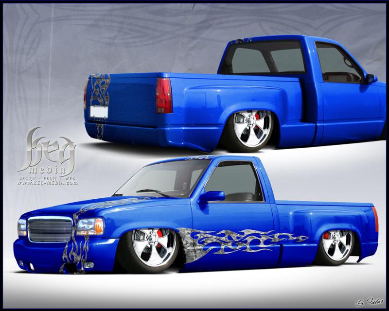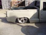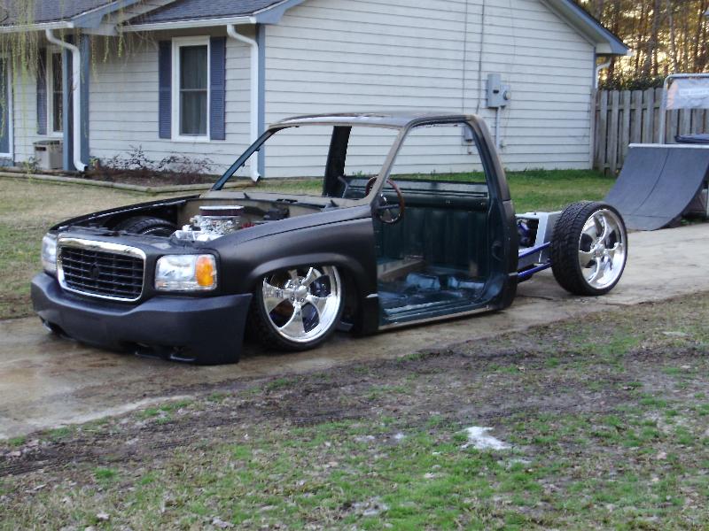 As of nov 08 the truck is setten at blockerboyscustoms in sc body is off the frame new frame with all new airride from suicidedoors.com added a wattslink airridetech control arms frame is being painted and supension parts powdercoated gona bolt up a new set of billet bonspeed 22s caddy clip is ready to go new paint with tribals new glass rino line the bed notch cover airbrushed dont know with what yet 8 6inch spikes to hold notch cover down some billet should be hitten up shows by first of next year when i get back from iraq will try and post some pics soon if you know where a good place to have the inside of the truck done around sc let me know