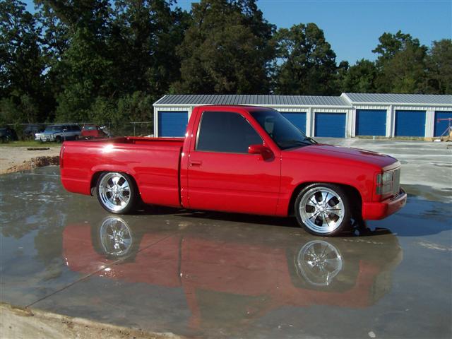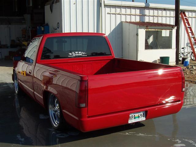 Shaved antenna, 3rd brake light , stake pockets , tailgate , molded roll pan , painted victory red by Joey Harris of Henderson,TN