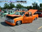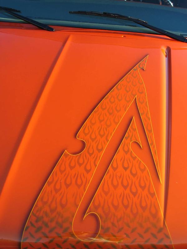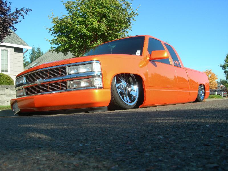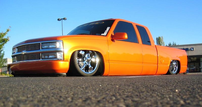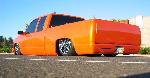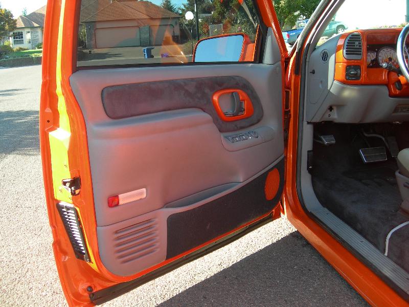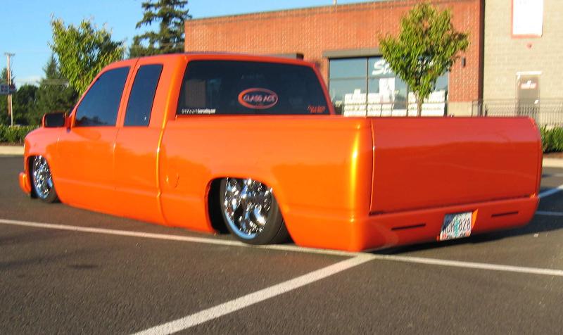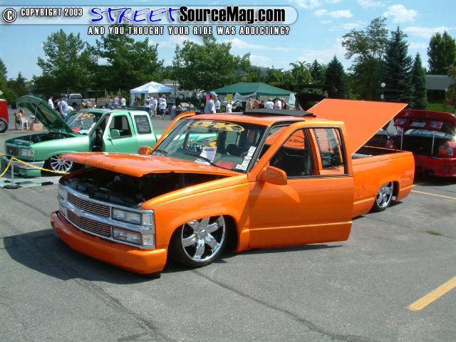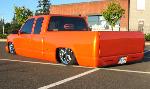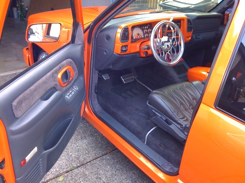 Shaved Everything, Sikkens Lamborghini Orange Pearl, Custom Graphics on the hood, LED Tail lights in the roll pan, French License Plate, Rag Top.