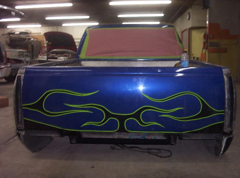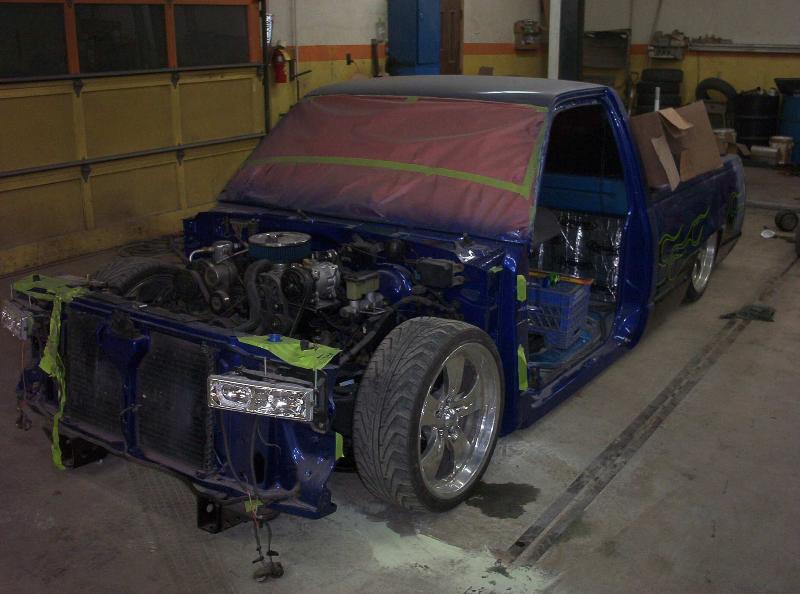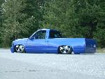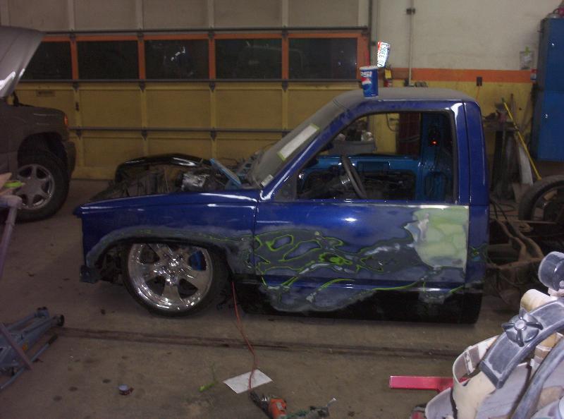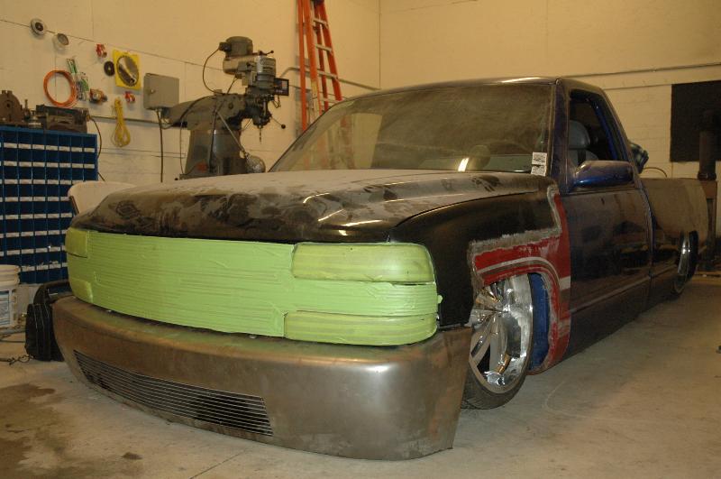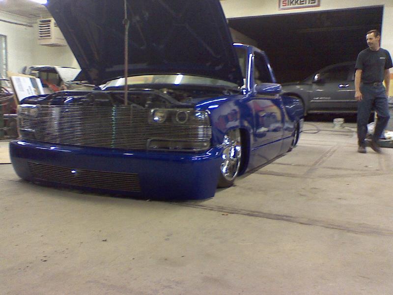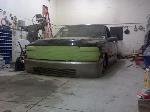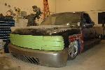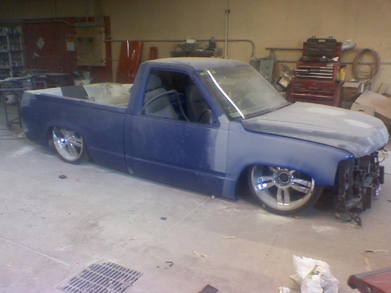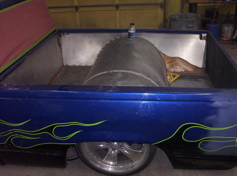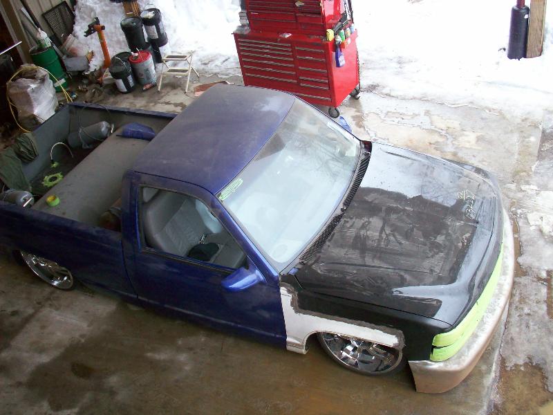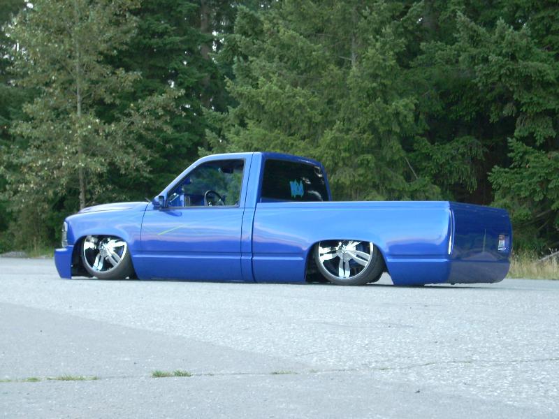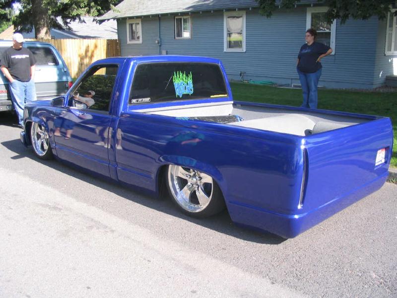 fully shaved, including tail gate, 88-93 Caddy tails, sheetmetal bed with hump, two tanks and a 15 gal fuel cell, 2&3/4" stock floor body drop, cowl hood, more bolt on shit,