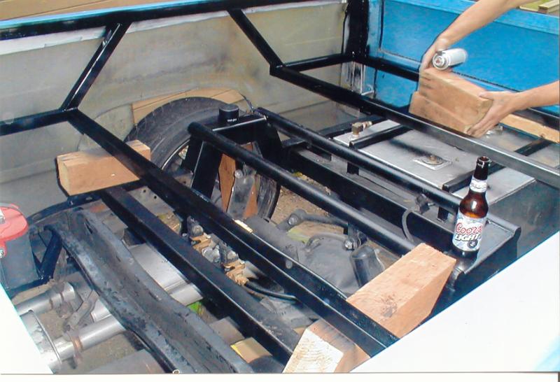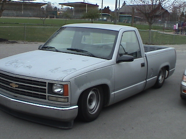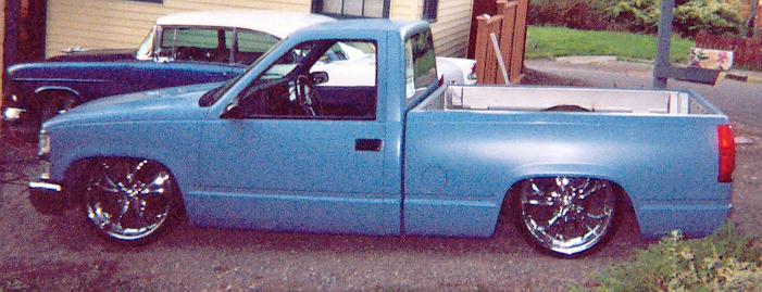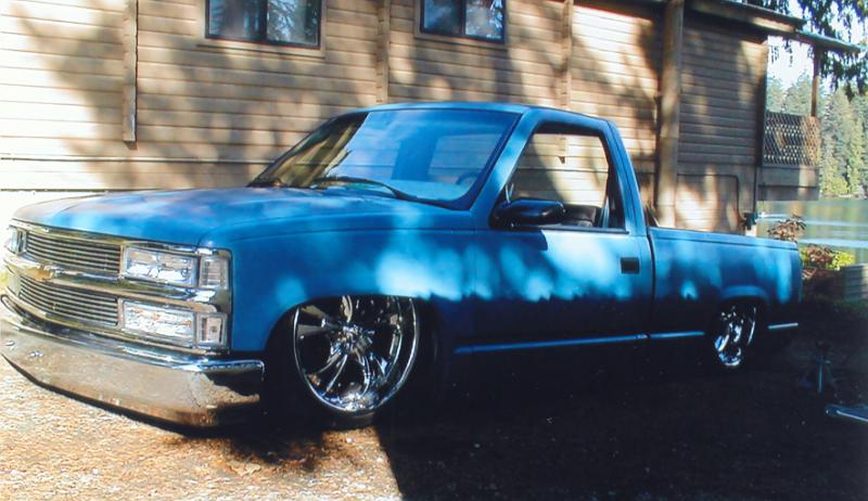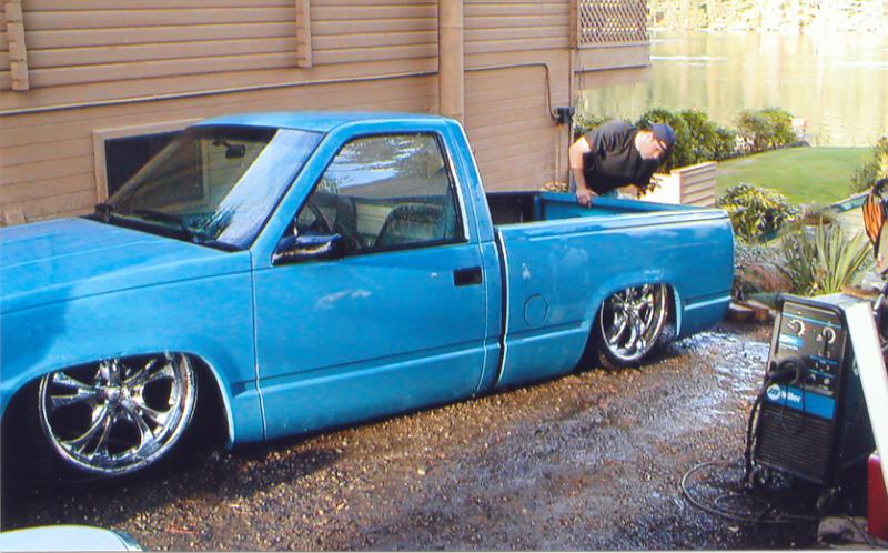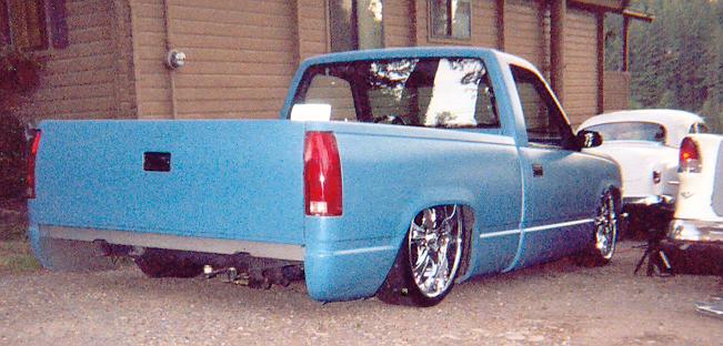krz upper and lower arms with slam bags lays rocker on 22's, ekstinsive metalworks two link rear firestone bags,relocated gas tank to a fuel cell in the rear 2.5 inch body drop