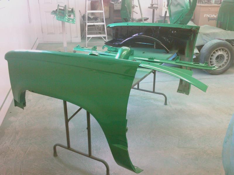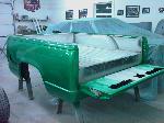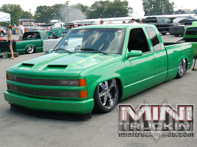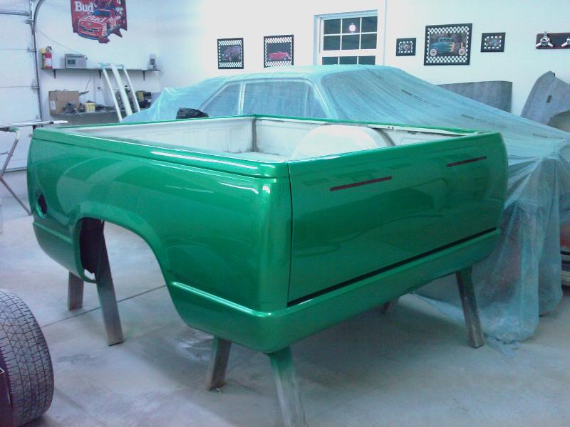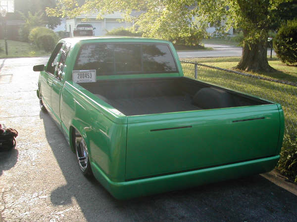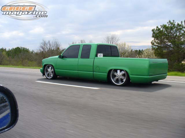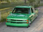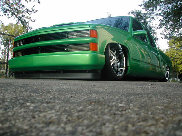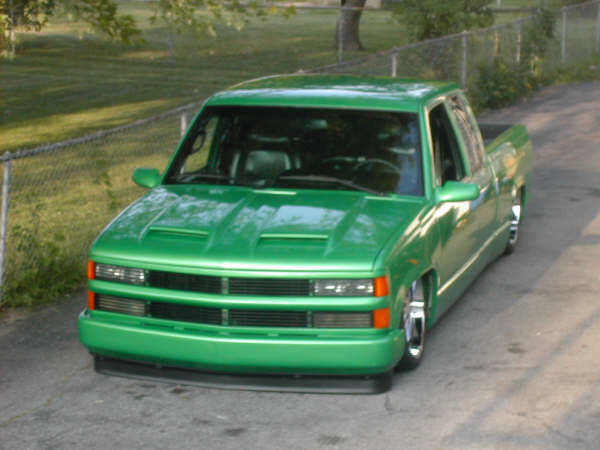 PPG electra green, with HOK grren ice pearl. Shaved clean with 15" led tails, Old school cowl hood. Blacked out phantom grill,