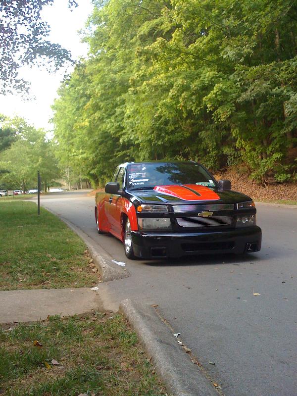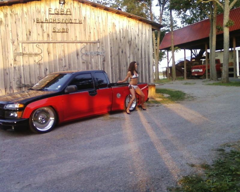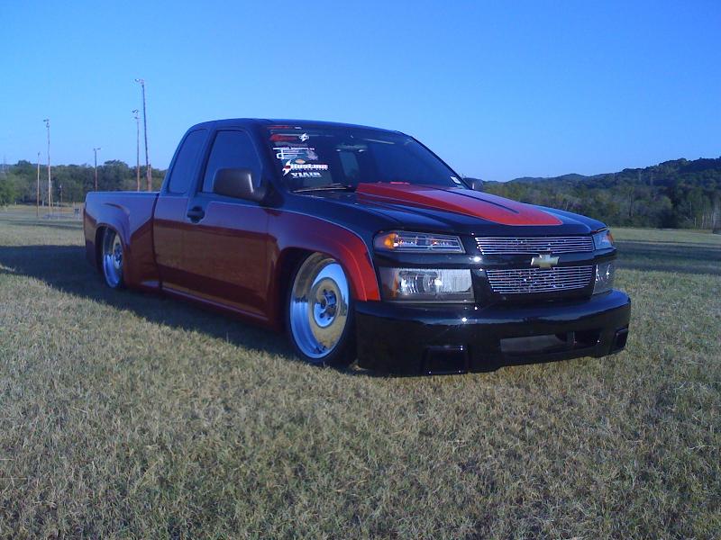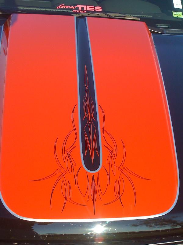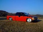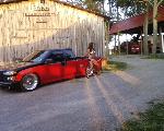 Red, Black, and silver with pinstriping, hood scoop, bed sheet metal and tubbed,
