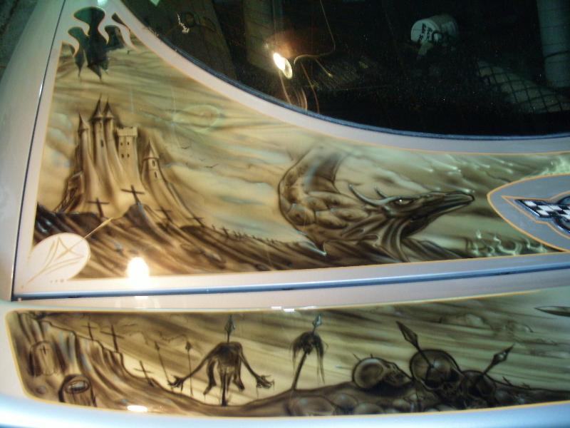 custom flames,rear spoiler, Custom airbrushed hood mural paintings under the car and new flame layout inside the door jams inside the rear hatch new paint on rear bumper